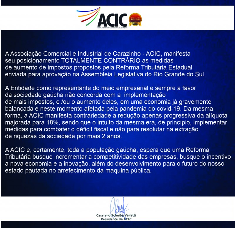 Posicionamento da ACIC em relação a Reforma Tributária proposta pelo governo estadual.