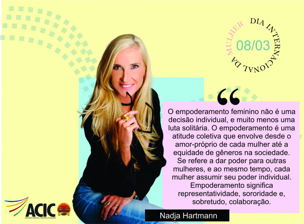 Hoje, a inspiração é Nadja Hartmann, Diretora de Comunicação da ACIC. Sua trajetória na entidade é marcada pela representatividade no meio da comunicação, onde inspira não somente suas companheiras de diretoria, mas toda a opinião da sociedade carazinhense. A Jornalista Nadja assina uma coluna política semanal no jornal Diário da Manhã de Carazinho, leciona na Universidade de Passo Fundo e ainda conduz o Departamento de Comunicação da ACIC.