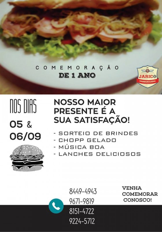 Para comemorar, nestes dias 5 e 6, a Jarico Hamburgueria oferecerá uma promoção especial, com sorteio de brindes, descontos, distribuição de chope e várias atrações musicais. Para pedir tele-entrega ou ficar por dentro do que a Jarico oferece, o telefone de contato é 3331-6580 e a página na internet é www.jaricohamburgueria.com.br