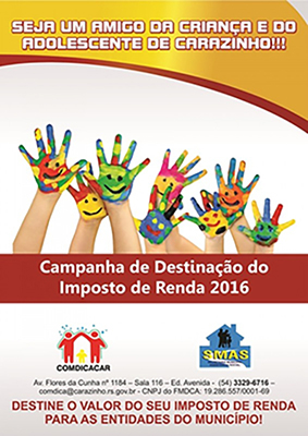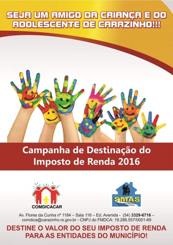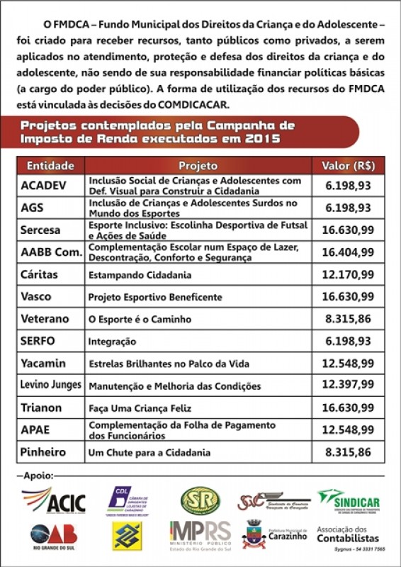 A campanha é uma realização do Comdicacar em parceria com as entidades de classe de Carazinho, ACIC, CDL, OAB/RS, Ministério Público, Sindicato Rural, Sindicar, Sindilojas, Associação dos Contabilistas de Carazinho, CRC/RS, Lojas Maçônicas, e Banco do Brasil. Confira nas fotos em anexo, as contas para o depósito da destinação e os valores repassados a cada entidade na última campanha.