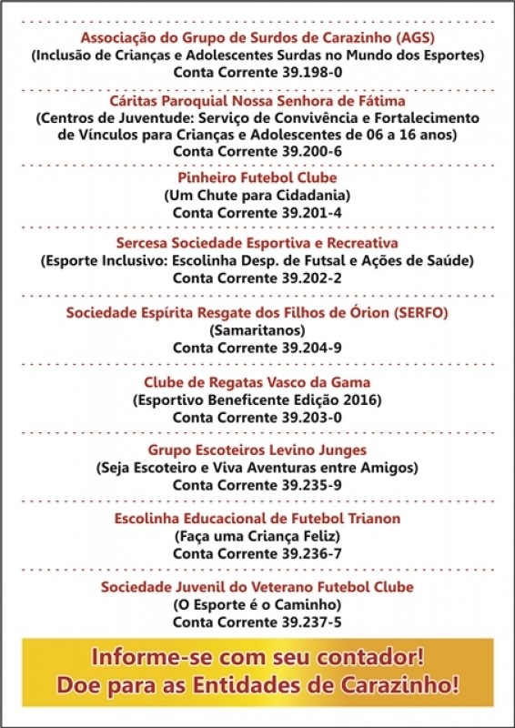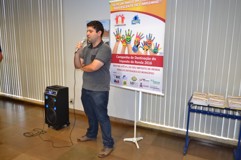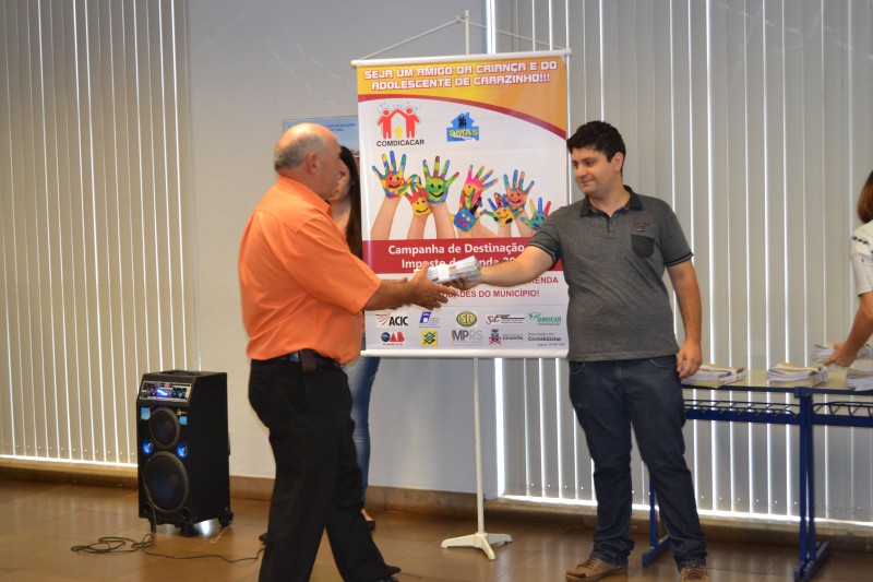 A campanha de destinação de incentivos fiscais do IR é uma promoção do Conselho Municipal dos Direitos da Criança e do Adolescente de Carazinho (Comdicacar), em parceria com a ACIC, CDL, Sindicato Rural, Sindilojas, Sindicar, OAB/RS, Banco do Brasil, Ministério Público, Prefeitura Municipal, Associação dos Contabilistas de Carazinho, CRC/RS e Secretaria Municipal de Assistência Social. O objetivo é que as entidades locais que prestam assistência a crianças, adolescentes e idosos sejam beneficiadas com valores oriundos de porcentagens do pagamento do imposto de renda devido de pessoas físicas e jurídicas.