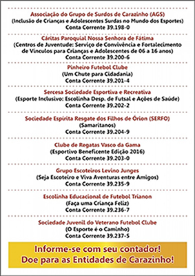 Do total arrecadado por cada entidade, 80% serão destinados ao projeto apresentado em edital e os outros 20% serão redistribuídos entre todas as entidades. A campanha vai até o dia 30 de dezembro de 2015.