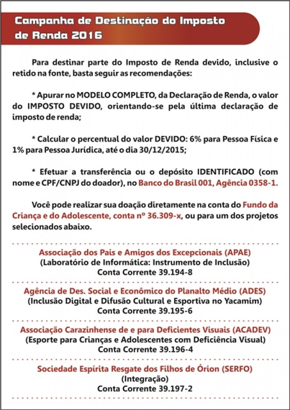 A campanha é promovida pela Secretaria Municipal de Assistência Social, em parceria com o Conselho Municipal dos Direitos da Criança e do Adolescente (Comdicacar) ACIC, CDL, Sindicato Rural, Sindilojas, Sindicar, OAB/RS, Banco do Brasil, Ministério Público, Prefeitura Municipal, Lojas Maçônicas, Associação dos Contabilistas de Carazinho e CRC/RS. Contadores responsáveis pela declaração do IR podem prestar toda a informação necessária para que a destinação seja feita.