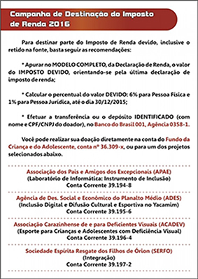 Neste ano, a campanha vai beneficiar 13 projetos previamente inscritos junto ao Comdicacar e selecionados por edital e ainda, o Fundo Municipal do Idoso. O depósito pode ser feito diretamente na conta bancária que beneficia o Fundo Municipal dos Direitos da Criança e do Adolescente/Idoso ou ainda, nas contas específicas de cada entidade beneficiada.