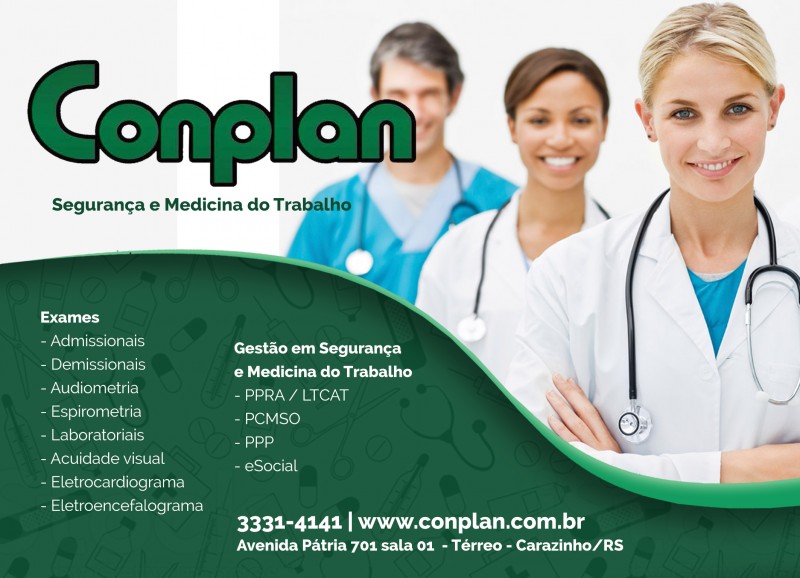 Atuando há 10 anos em Carazinho, a Conplan Segurança e Medicina do Trabalho começa o ano de 2016 com o objetivo de tornar a Clínica cada vez mais ágil na prestação de serviços. Realiza serviços nas áreas de engenharia de segurança e medicina do trabalho, como laudos PPRA/LTCAT, PCMSO, PPP; treinamentos de segurança do trabalho e exames admissionais, demissionais e complementares, como audiometria, espirometria, eletrocardiograma, eletroencefalograma, acuidade visual e laboratoriais.