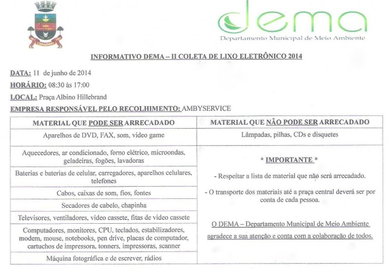Na próxima quarta-feira (11) o Departamento Municipal de Meio Ambiente (DEMA) realiza a II Coleta de lixo eletrônico 2014, na Praça Albino Hillebrand, durante os seguintes horários 08h30min às 17h. Confira no informativo abaixo os materiais que podem e os que não podem ser arrecadados.