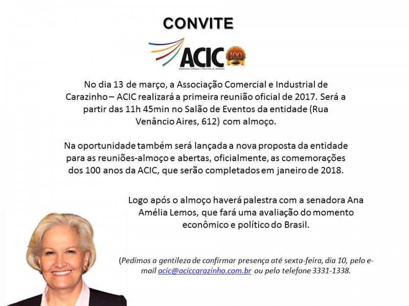 Na próxima segunda-feira, 13, a Associação Comercial e Industrial de Carazinho (ACIC) recebe a senadora Ana Amélia Lemos (PP) para a primeira reunião-almoço da entidade em 2017. O evento marca o início de uma nova proposta da ACIC para as já tradicionais reuniões-almoço, que agora passam a se chamar Ideias na Mesa.