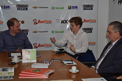 Cumprindo com um dos objetivos da entidade, de oportunizar espaços democráticos para exposição de ideias e diferentes posições políticas, a ACIC recebeu para o Ideias na Mesa desta segunda-feira o deputado suplente Marcel Van Hattem. Além dos diretores e conselheiros da entidade, a reunião também contou com a presença do vereador de Não-Me-Toque, Charles Moraes e do presidente do Sindicato Rural de Carazinho, Leomar Tombini. Eleito pelo PP, Van Hattem esteve em Carazinho no mesmo dia que oficializou a sua filiação ao partido Novo, sigla pela qual ele deve disputar uma cadeira na Câmara dos Deputados.