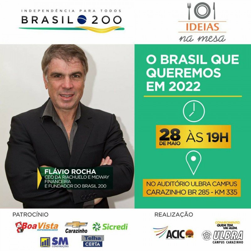 A Associação Comercial e Industrial de Carazinho – ACIC, tem a honra e satisfação em convidar seus ASSOCIADOS para participar da palestra: O BRASIL QUE QUEREMOS PARA 2022, com o Pré-candidato à Presidência da República, CEO da Riachuelo e Midway Financeira, FLÁVIO ROCHA.