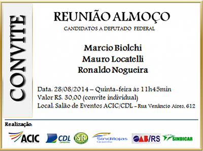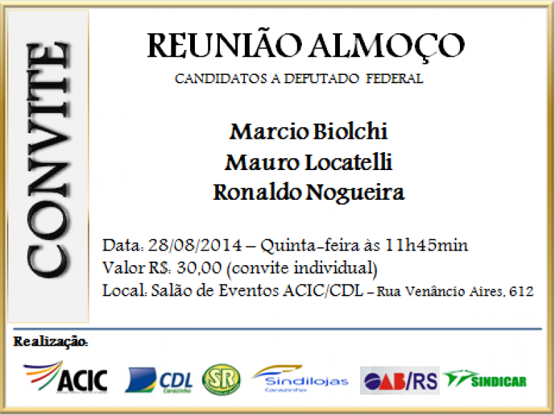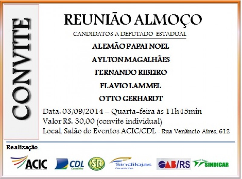 As entidades de classe de Carazinho ACIC – Associação Comercial e Industrial de Carazinho, CDL – Câmara de Dirigentes Lojistas de Carazinho, Sindilojas Carazinho, Sindicato Rural de Carazinho, OAB/RS Subseção Carazinho e SINDICAR – Sindicato das Empresas de Transportes de Cargas de Carazinho e Região, cientes da importância do pleito que se aproxima, estão proporcionado espaço aos candidatos a Deputado Federal e Estadual de Carazinho para apresentares as suas propostas às diretorias das seis entidades e demais convidados.