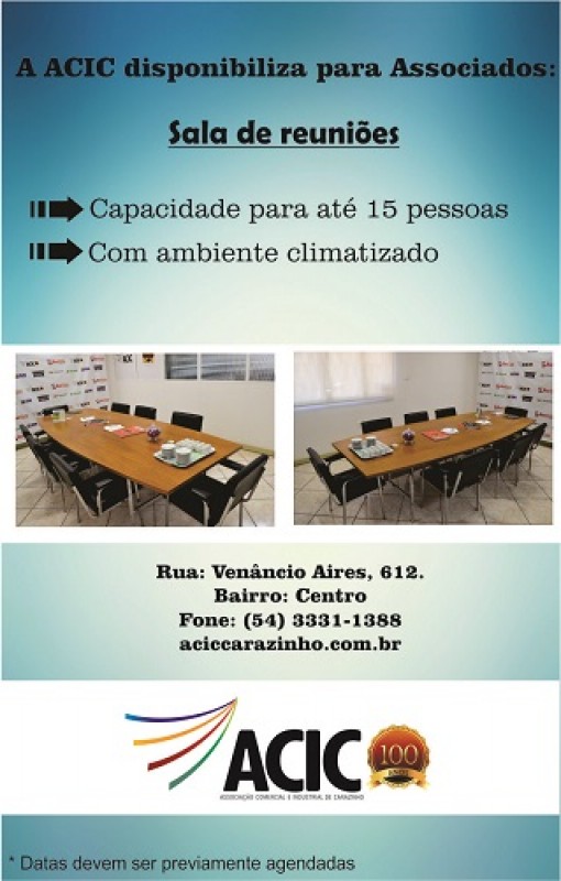 A ACIC oferece para associados: Sala de reuniões, com capacidade para 15 pessoas e com ambiente climatizado.