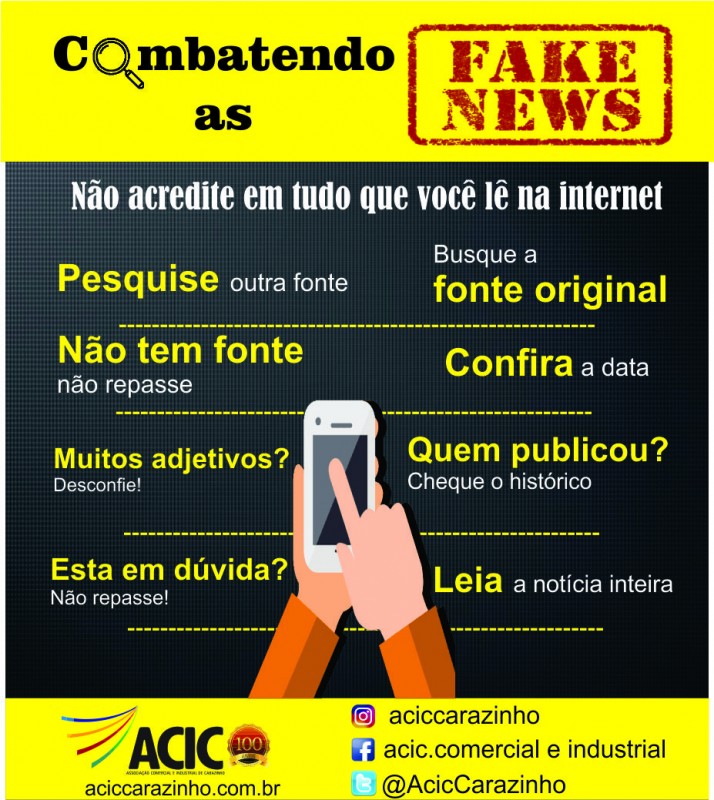 A Associação Comercial e Industrial de Carazinho (ACIC) é parceira da Ordem dos Advogados do Brasil (OAB), CDL, Sindilojas, Sindicato Rural de Carazinho, e Sindicar na campanha do Voto Consciente e consequentemente no combate as fakes news que podem influenciar o eleitor de maneira errônea. O usuário de redes sociais e que tem uma enorme facilidade de acesso a notícias através da internet deve seguir alguns passos básicos de identificação destas, com isso a ACIC criou um pequeno quadro funcional ilustrando como o usuário deve proceder quando tiver acesso a algum tipo de notícia e pode verificar sua autenticidade.