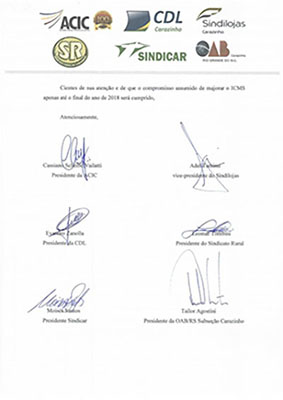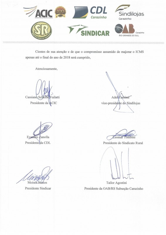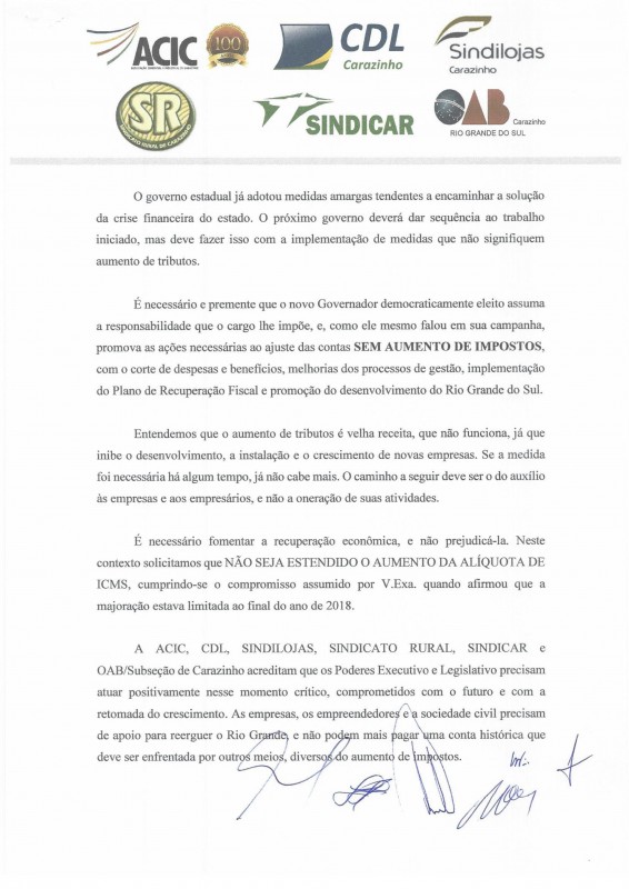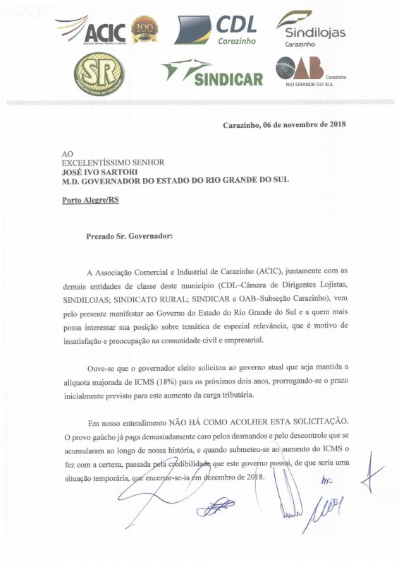A Associação Comercial e Industrial de Carazinho (ACIC) juntamente com as demais entidades de classe do município; Câmara de Dirigente Lojistas (CDL); SINDILOJAS; SINDICATO RURAL; SINDICAR e OAB – Subseção Carazinho, manifestaram-se através de ofício ao Governador do Estado do Rio Grande do Sul, José Ivo Sartori, que NÃO HÁ COMO ACOLHER A SOLICITAÇÃO feita pelo governador eleito em conservar a alíquota majorada do ICMS (18%) por mais dois anos prorrogando assim, o prazo inicialmente previsto para encerrar em dezembro de 2018.