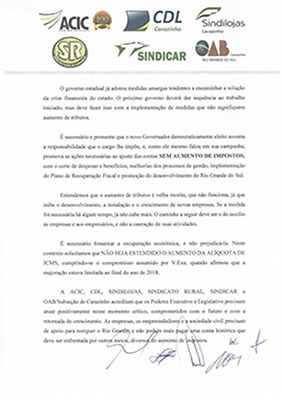 A ACIC juntamente com as demais Entidades de Carazinho acredita que os Poderes Executivo e Legislativo precisam atuar positivamente nesse momento crítico, comprometidos com o futuro e com a retomada do crescimento, haja vista que as empresas, empreendedores e a sociedade civil precisam de apoio para reerguer o Estado e não podem mais pagar uma conta histórica que deve ser enfrentada sem o AUMENTO DE IMPOSTOS.