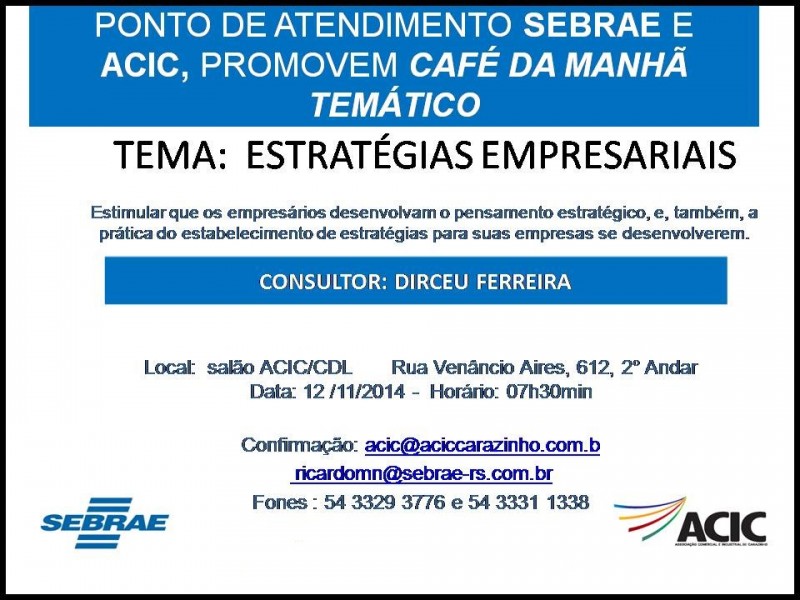 Convidamos a todos os Micro e Pequenos Empresários para que venham até a ACIC (Rua Venancio Aires, 612) dia 12/11/2014 às 7h30min.