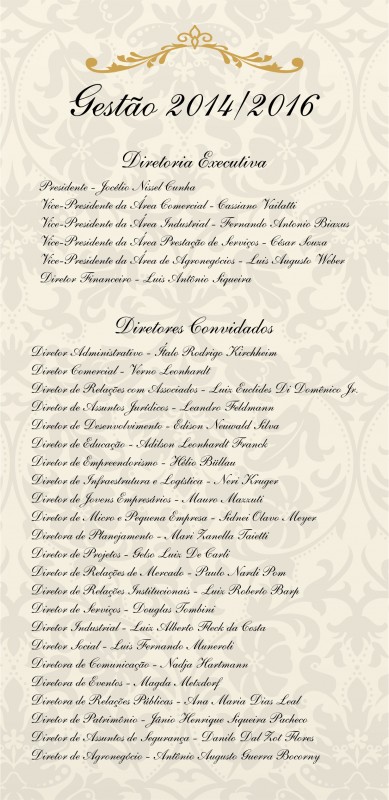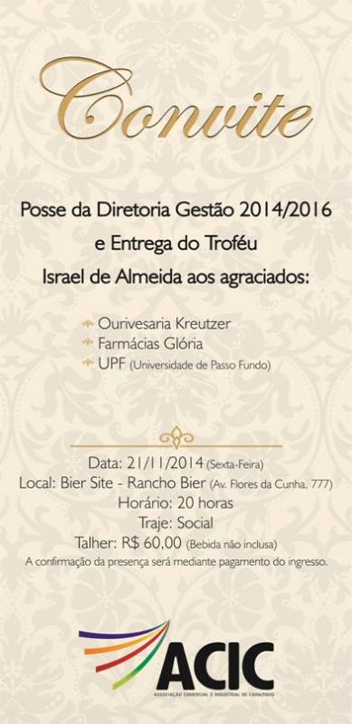 ACIC realiza evento de POSSE DA NOVA DIRETORIA EXECUTIVA GESTÃO 2014 - 2016 da ACIC que será no dia 21/11/2014 (sexta – feira) às 20horas na Bier Site – Rancho Bier. Na oportunidade a ACIC realizará a entrega do troféu “ISRAEL DE ALMEIDA” IV edição para as seguintes empresas agraciadas: OURIVESARIA KREUTZER, FARMÁCIAS GLÓRIA e UPF - Universidade de Passo Fundo.